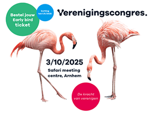 Het is zover! De inschrijving voor het Verenigingscongres op vrijdag 3 oktober 2025 is geopend. Dit jaar staat het congres in het teken van ‘De kracht van verenigen’ en vindt plaats op een inspirerende locatie: het Safari Meeting Centre in Arnhem. Omringd door de natuur en wilde dieren ontdekken we hoe samenwerking en verbinding de sleutel vormen tot een sterke vereniging. Wil je zeker zijn van je deelname tegen het voordelige earlybird-tarief? Meld je dan vóór 1 mei 2025 aan!
